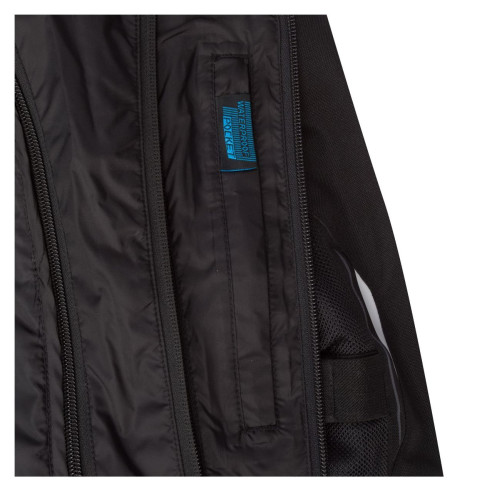 - Komfort: 4 udvendige lommer, 2 indvendige lommer, vandtæt lomme til pung, anti-fladren-system på ærmerne, snøre i håndleddet, snøre i hoften, dobbelt lynlås foran, gennemgang til buksesamling, justerbar lomme til albuebeskyttere
