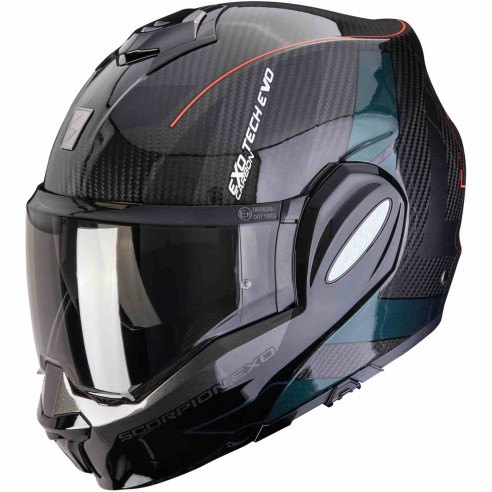 SCOPRION EXO-TECH EVO CARBON er en fremragende motorcykelhjelm, der imponerer med sin lethed og elegante fuldansigtsdesign. Et flip-back mesterværk, det tilbyder nem betjening og mange praktiske funktioner. Med en carbon hjelmskal er den ikke kun let, men også ekstrem robust og sikker.